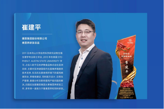 此次獲獎,是對崔建平博士專業(yè)能力與創(chuàng)新精神的高度認(rèn)可,更是對播恩蛋雞料研發(fā)成果的肯定。展望未來,播恩集團(tuán)將持續(xù)加大蛋雞料研發(fā)投入,推出更多創(chuàng)新優(yōu)質(zhì)產(chǎn)品,攜手養(yǎng)殖戶共創(chuàng)畜牧行業(yè)美好未來,持續(xù)引領(lǐng)蛋雞料行業(yè)創(chuàng)新發(fā)展潮流。